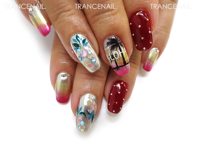 ハワイ こんにちは♪ お客様ネイルのご紹介です。 ハワイをイメージしたクールなデザイン。 ミラーベースのピンク・イエローグラデーションが可愛いです♬ ★参考価格(税込)¥11,000 ※オフは別途1本200円です。 ★新規のお客様は上記価格より20%OFFです。 ★ご予約はお電話(0797-75-7366)または予約フォームより受け付けております。 ★空席情報はこちらからご覧ください。