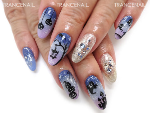 ハロウィンネイル こんにちは♪ お客様ネイルのご紹介です。 アッシュブルーベースの影絵風ハロウィンネイル。 幻想的でキュートなデザインです。ぜひお試しください^^)♪ ★参考価格(税込)¥13,000 ※オフは別途1本200円/長さ出し1本300円です。 ★新規のお客様は上記価格より20%OFFです。 ★ご予約はお電話(0797-75-7366)または予約フォームより受け付けております。 ★空席情報はこちらからご覧ください。