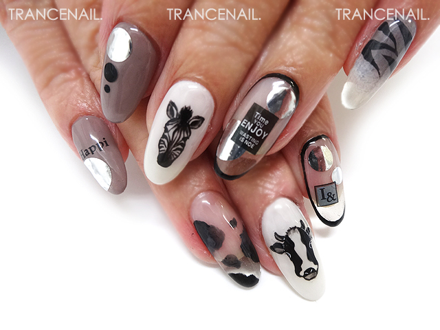モノトーンをベースにしたシマウマと牛のミックスネイル。