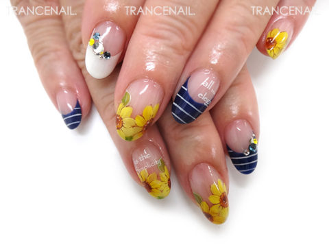 ひまわりフレンチ こんにちは♪ お客様ネイルのご紹介です。 鮮やかでアイコニックなひまわりフレンチ。 夏を意識したネイビーのボーダーも素敵です^^)♪ ★参考価格(税込)¥13,200 ※オフは別途1本200円です。 ★新規のお客様は上記価格より20%OFFです。 ★ご予約は、お電話(0797-75-7366)または予約フォームより受け付けております。 ★空席情報はこちらからご覧ください。 ★サロンの衛生対策はこちらからご覧ください。