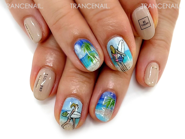 サーフィン こんにちは♪ お客様ネイルのご紹介です。 ビーチとサーファーのイラストを描きました。 上品で落ち着いたベージュベースのネイルです♥ ★参考価格(税込)¥11,700 ※オフは別途1本200円です。 ★新規のお客様は上記価格より20%OFFです。 ★ご予約はお電話(0797-75-7366)または予約フォームより受け付けております。 ★空席情報はこちらからご覧ください。 ★サロンの衛生対策はこちらからご覧ください。