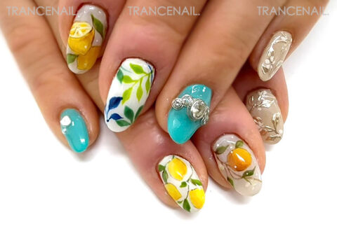レモン&オレンジ こんにちは♪ お客様ネイルのご紹介です。 みずみずしいレモンとオレンジのイラスト。 差し色のターコイズも素敵です♥ ★参考価格(税込)¥12,300 ※オフは別途1本200円です。 ★新規のお客様は上記価格より20%OFFです。 ★ご予約はお電話(0797-75-7366)または予約フォームより受け付けております。 ★空席情報はこちらからご覧ください。 ★サロンの衛生対策はこちらからご覧ください。 ネイルケア・アートランキング